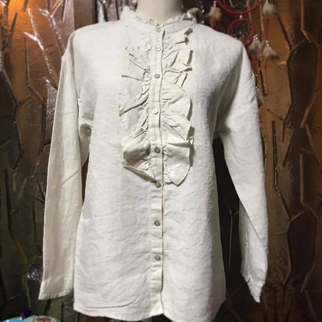 crea delice 麻100% フリル使いブラウス Mベージュ